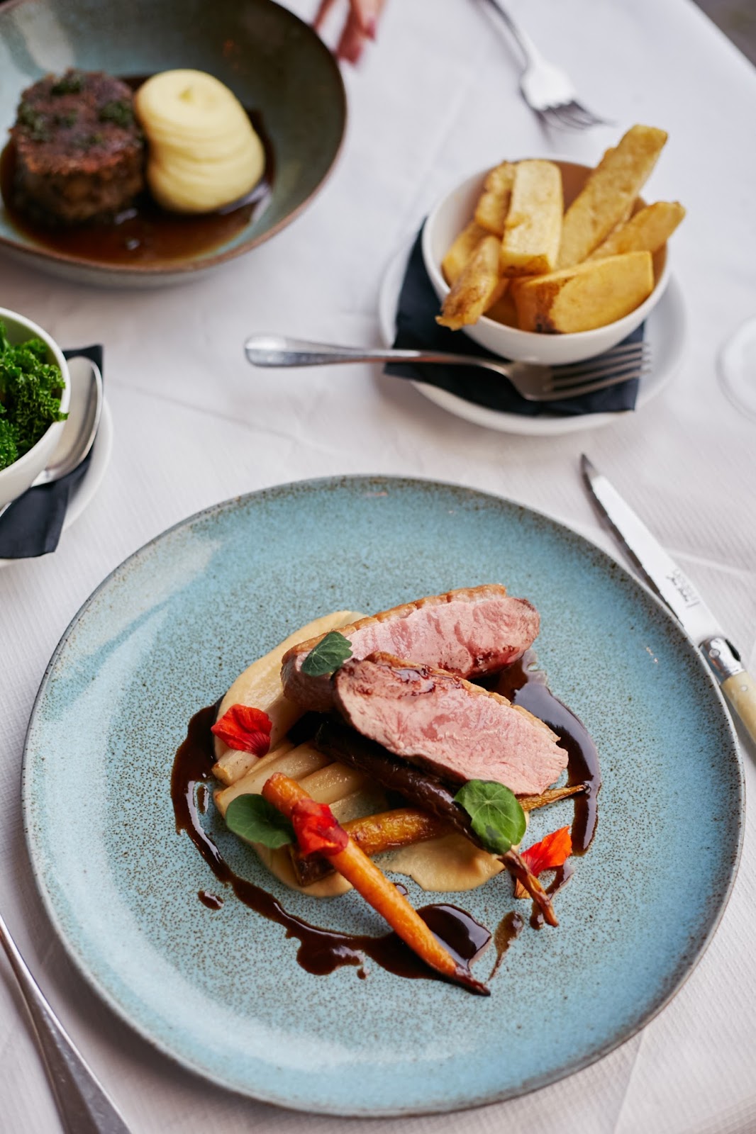 Such a variety of dishes on the menu to choose from. My starter of beef rump and a mini scotch egg set the bar pretty high for the rest of the meal as the meat truly melted in my mouth. But the main course of seared duck and seasonal veg followed by my desert, chocolate peanut butter pie with coffee ice cream both lived up to those very high standards. Claire’s dishes were equally delicious. Scallops with truffles and field mushrooms. For main, braised lamb and creamy mash followed by a sticky date toffee pudding.